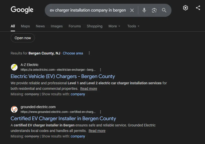 Grounded Electric currently ranks in second place for “EV charger installation company in Bergen County NJ” at the time of writing, a competitive and high-intent term in a rapidly growing market.