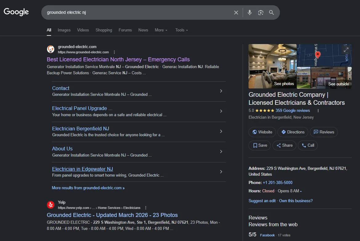 GroundedElectric.com began as a local electrician serving homeowners across Bergen County, NJ. Through a targeted local SEO strategy, the business now receives over 5,000 monthly clicks that have translated into daily service calls for their team.